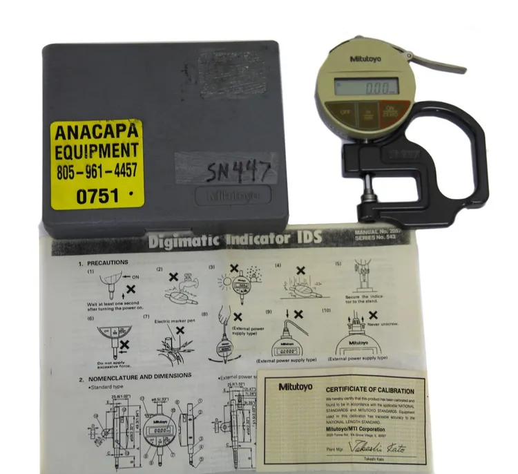 <style>img{max-width:100%}</style><!-- Begin Description --><font rwr="1" size="4" style="font-family:Arial"><meta name="viewport" content="width=device-width"><font rwr="1" size="4" style="font-family:Arial"><style> a.imagelink {color:#0000FF;} a:hover.imagelink {color:#0000FF;} a:visited.imagelink {color:#800080;} a.imagelink img.auctionimage { border: 2px solid #0000FF; } a:visited.imagelink img.auctionimage { border: 2px solid #800080; } </style><table width="95%" border="0" align="center" class="acttbl"> <tbody><tr> <td> <table border="0" width="100%"> <tbody><tr><td valign="top" width="100%"> <table border="0" cellpadding="8" align="center" width="95%" class="acttbl"><tbody><tr><td width="100%" class="acttbl"> <font><!-- Start Description AucLister --><!--Template created by Amber Miller for Auctiva Corp. 11/07/07--><!-- Auctiva Corporation - Copyright 1999-2007. Auctiva Corporation maintains all rights to the HTML and images used to create this template. Unauthorized Duplication is Prohibited. --> <table align="center" cellpadding="0" cellspacing="0" style="border: 2px solid #27578D;" width="95%"> <tbody> <tr> <td align="right" valign="top"><img src="https://ti2.auctiva.com/tia/1DDA37/blueandwhite/sb_tplftcrn.gif"></td> <td background="https://ti2.auctiva.com/tia/1DDA37/blueandwhite/sb_tpbg.gif" valign="top" width="100%"> </td> <td align="left" valign="top"><img src="https://ti2.auctiva.com/tia/1DDA37/blueandwhite/sb_tprtcrn.gif"></td> </tr> <tr> <td align="right" background="https://ti2.auctiva.com/tia/1DDA37/blueandwhite/sb_lftbg.gif" valign="top" width="66px"> </td> <td bgcolor="#ffffff" colspan="1" valign="top"> <table align="center" cellpadding="0" cellspacing="0" width="100%"> <tbody> <tr> <td> <center><font face="Times New Roman" size="5" color="#00429a"><strong>Mitutoyo Digimatic Indicator </strong><b> IDS-1012EB 543-611B </b><b style="caret-color: rgb(51, 51, 51);">Series 543 (751)W</b></font></center><center><font size="4" face="Times New Roman" color="#00429a"><b>May need calibration. Working condition. Paint loss on handle that does not affect function. See pictures for more details.</b></font></center><center style="text-align: start;"><br></center> </td> </tr> </tbody> </table> <style type="text/css">.acttbl > font { font-family: Arial, Times New Roman, Verdana; color: #27578D; font-size: 13px; } </style> <!--AUCTIVABODYSTART--><!--AUCTIVAHEADERSTART--> <div align="center"> </div> <ul> <li style="text-align: left;"><span style="color:#000000;"><span style="font-size:20px;"><span style="font-family:times new roman,times,serif;">Manufacturer: Mitutoyo </span></span></span></li><li style="text-align: left;"><span style="color:#000000;"><span style="font-size:20px;"><span style="font-family:times new roman,times,serif;">Reverse anvil</span></span></span></li> <li style="text-align: left;"><span style="color:#000000;"><span style="font-size:20px;"><span style="font-family:times new roman,times,serif;">Digimatic Indicator 543-611B</span></span></span></li><li style="text-align: left;"><span style="color:#000000;"><span style="font-size:20px;"><span style="font-family:times new roman,times,serif;">.0005-.5"/0.01-12.7mm</span></span></span></li> <li style="text-align: left;"><span style="color: rgb(0, 0, 0); font-family: 'times new roman', times, serif; font-size: 20px; line-height: 32px;">Mitutoyo Certificate of Calibration included from manufacturer, may need calibrating.</span></li> <li style="text-align: left;"><span style="color: rgb(0, 0, 0); font-family: 'times new roman', times, serif; font-size: 20px; line-height: 32px;">Operation Manual, Battery and case included</span></li> </ul> <div align="center"><br> <span style="color:#000000;"><strong style="line-height: 20.7999992370605px; text-align: -webkit-center;"><span style="font-size: 20px;"><span style="font-family: 'times new roman', times, serif;">Sold as is with 30 day Right of Return, only pictured items included</span></span></strong></span><br> </div> <div align="center"><div align="center"><font face="times new roman, times, serif"><span style="font-size: 20px;"><b>Easy Returns</b></span></font></div><div align="center"><font face="times new roman, times, serif"><span style="font-size: 20px;"><b><br></b></span></font></div><div align="center"><font face="times new roman, times, serif" color="#0063ab"><span style="font-size: 20px;"><b>ANACAPA EQUIPMENT</b></span></font></div></div><div align="center"> <span style="font-size:8px;"> </span><span style="font-family:times new roman,times,serif;"><span style="font-size:8px;"> </span></span></div> <div><span style="color:#000000;"><span style="font-family:times new roman,times,serif;"><span style="font-size:20px;"><strong>RETURNS</strong></span></span></span></div> <div style="text-align: left;"><span style="color:#000000;"><span style="font-family:times new roman,times,serif;"><span style="font-size:16px;">Anacapa Equipment strives to offer excellent customer service. You may return any equipment purchased from us for any reason within thirty (30) days after your receipt of the equipment for a full refund of the purchase price, provided that returned items must be received in the same condition as sent.</span></span></span></div> <div align="center"> </div> <div style="text-align: left;"><span style="color:#000000;"><span style="font-family:times new roman,times,serif;"><span style="font-size:20px;"><strong>SHIPPING </strong></span></span></span></div> <div style="text-align: left;"><span style="color:#000000;"><span style="font-family:times new roman,times,serif;"><span style="font-size:16px;">All equipment purchased is shipped within one (1) day (subject to freight availability) after receipt of payment and is shipped FOB place of shipment. We only charge actual shipping cost. If eBay overcharges for shipping, we issue an immediate refund for the difference. If you are undercharged, we will absorb the cost.</span></span><span style="font-size:20px;"><span style="