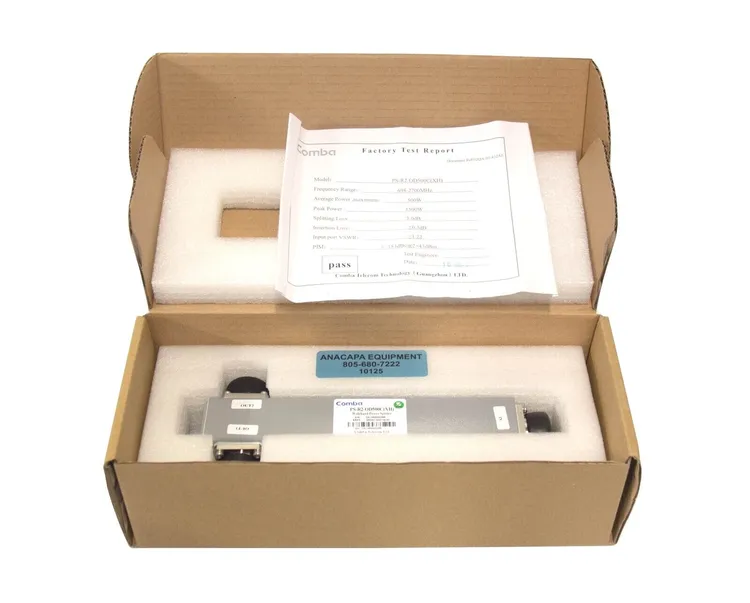 <p><span style='font-size: 20px; font-family: "times new roman", times, serif; color: rgb(0,0,0)'>Manufacturer: </span><span style='font-size: 20px; font-family: "times new roman", times, serif; color: rgb(0,0,0)'>Comba<br />Model: PS-R2-OD500C(XH)<br /><br />Specifications: The following specifications were taken from an online user manual or manufacturer's website and may not be specific to this item, please look at pictures carefully for items included and specifics. These specifications are for reference only.<br /><br />Configuration: 2 Way<br />Type: Reactive Power Divider<br />Frequency: 698 MHz to 2.7 GHz<br />Insertion Loss: 0.3 dB<br />Input Power: 500 W<br />PIM: -153 dBc<br />Impedance: 50 Ohms<br />VSWR: 1.22:1<br />VSWR Input: 1.22:1<br />Peak Input Power: 1 kW<br />Package Type: Module with Connectors<br />Connector: DIN, DIN - Female<br />Grade: Commercial<br />RoHS: Yes<br />Operating Temperature: -40 to 60 Degree C<br />Note: Split Loss : 3 dB<br /><br />Dimensions<br />Actual Dimensions: 9.1 x 4 x 2"<br />Actual Weight: 3 lb</span><span style="font-size: 20px; font-family: times new roman, times, serif; color: #000000"></span><br /></p>